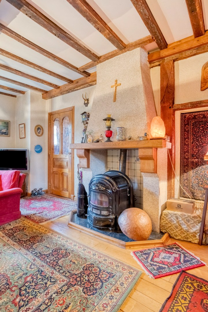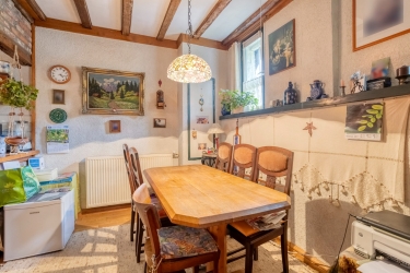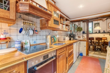 Centraal in de woning bevindt zich de royale, L-vormige woonkamer. De zichtbare houten draagbalken aan het plafond, de authentieke schouw met haard en de open indeling geven het geheel een warme en uitnodigende uitstraling. Hier creëert u moeiteloos een gezellige zithoek én een ruime eethoek, een ideale plek om te ontspannen of om gasten te ontvangen.