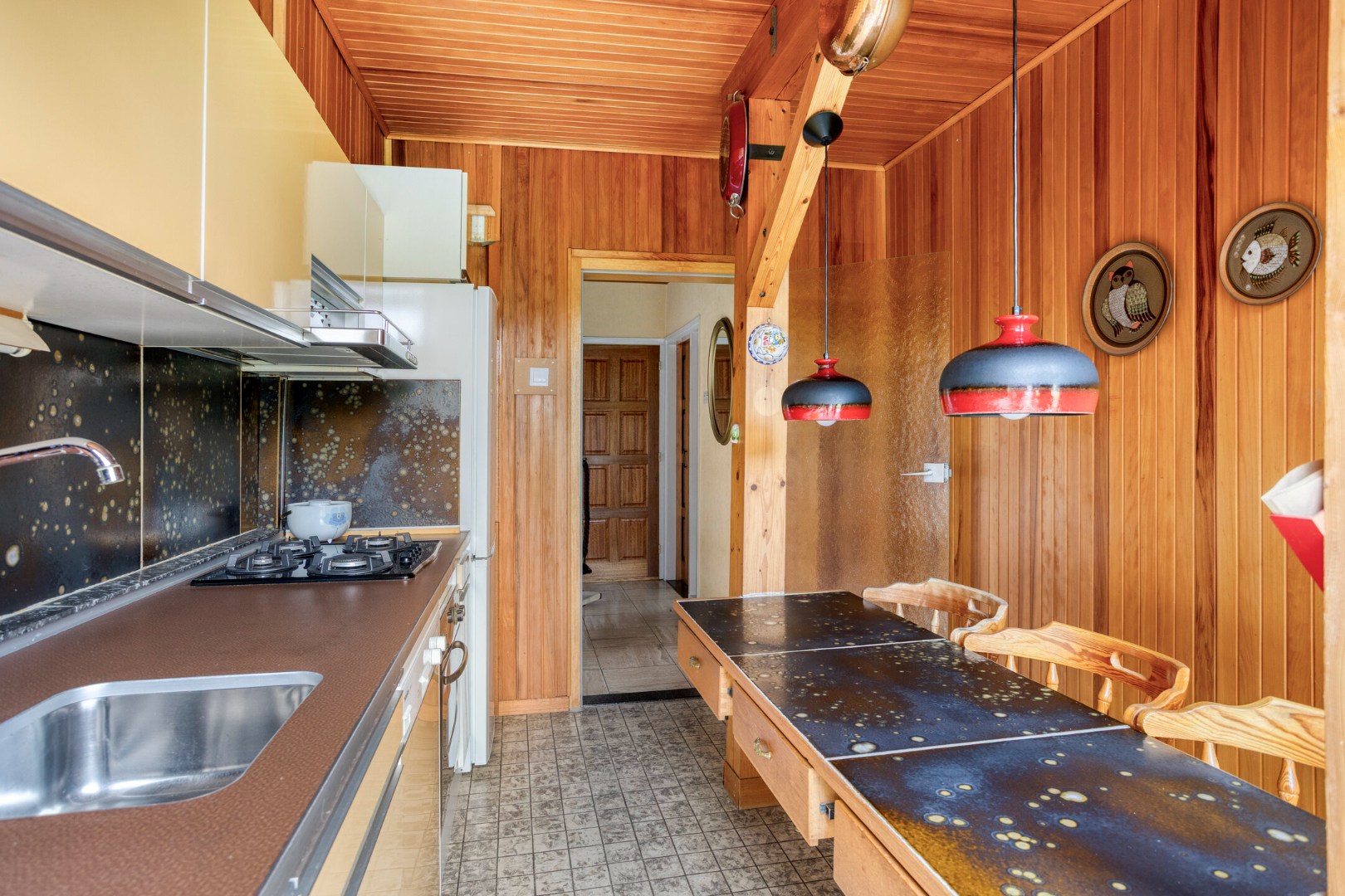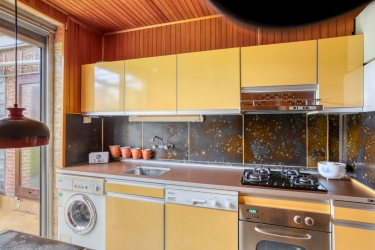 Via de overkapping bereikt u de entree, waar de hal toegang geeft tot het toilet, de trapopgang, keuken en de woonkamer. De woonkamer (ca. 25 m2) strekt zich uit over de gehele diepte van de woning, met een grote raampartij aan de voorzijde en een schuifpui naar de tuin aan de achterzijde. De stenen schouw vormt een authentiek element dat meteen opvalt. Aangrenzend ligt de keuken (ca. 8,5 m2), verrassend ruim opgezet met plek voor een ontbijthoek en een directe verbinding met het overdekte terras middels een tuindeur. De keuken is gedateerd, maar wel volledig functioneel en voorzien van diverse apparatuur, waaronder een gas-op-glaskookplaat, vlakschermafzuigkap, oven en vaatwasser. Daarnaast is er een nis voor een koelkast en vindt u hier ook aansluitingen voor een wasmachine. Vanuit de hal bereikt u tevens het souterrain, zodat elke woonlaag logisch met elkaar verbonden is.