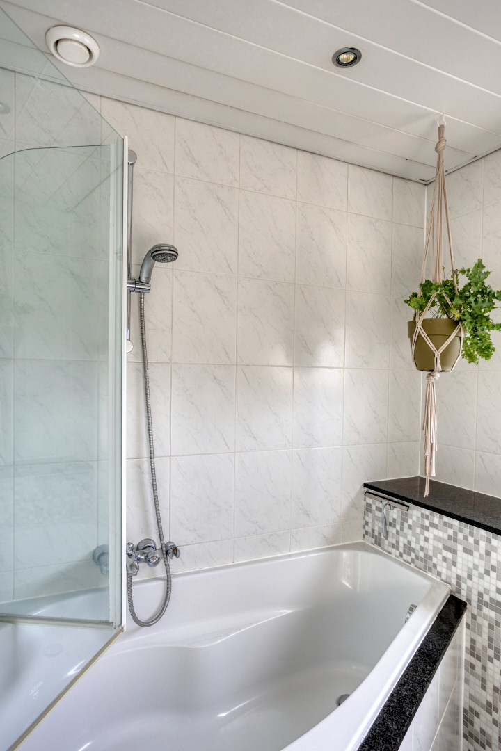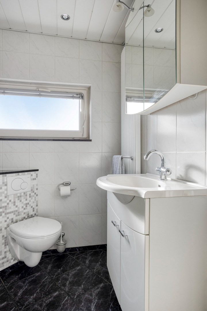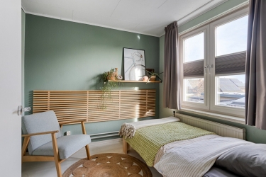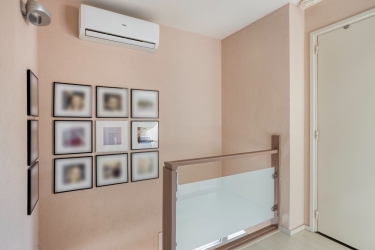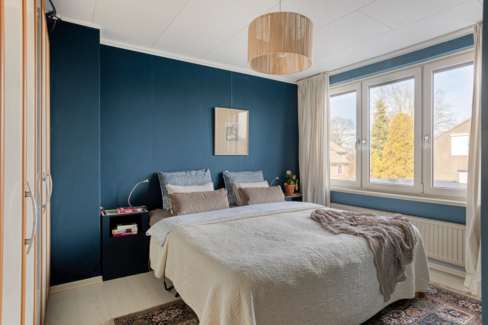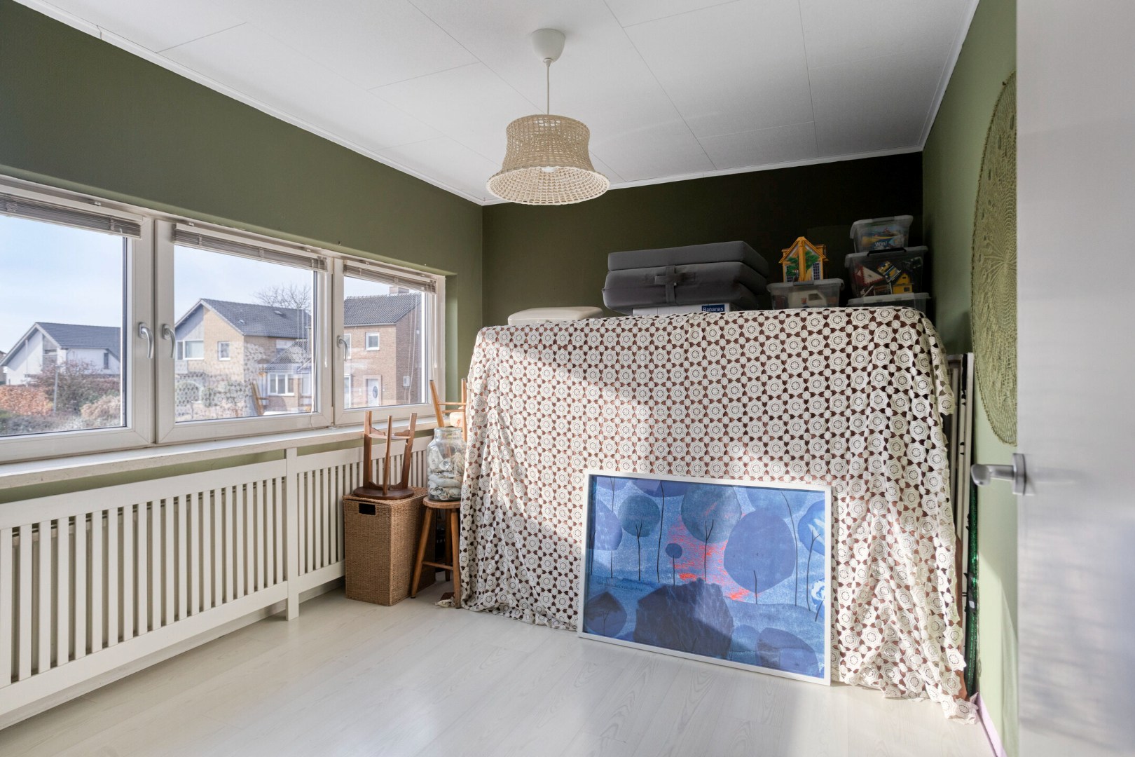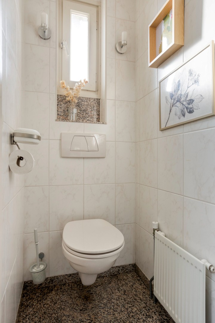 Op de eerste verdieping grenzen er drie slaapkamers en de badkamer aan de overloop, welke is voorzien van airconditioning. De kamers zijn stuk voor stuk verzorgd afgewerkt en prettig van formaat. Er is voldoende ruimte voor een tweepersoonsbed en kastenwand in de hoofdslaapkamer, terwijl de overige kamers zich uitstekend lenen als kinder-, werk- of logeerkamer. De badkamer is netjes uitgevoerd en beschikt over een ligbad met douchemogelijkheid, wastafelmeubel en een tweede toilet. Dankzij het raam is er natuurlijke ventilatie en daglicht, wat bijdraagt aan het frisse karakter van deze ruimte. Ook hier sluit de afwerking goed aan bij de rest van de woning.