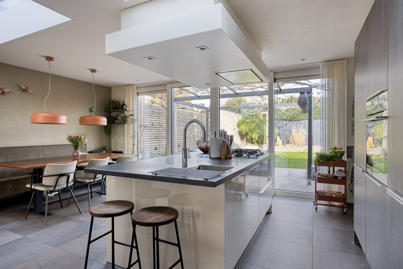 Richting de achterzijde opent de woning zich verder en ontstaat er een natuurlijke overgang naar de woonkeuken. Deze uitbouw heeft het karakter van de begane grond zichtbaar versterkt en vormt een plek waar wonen en leven samenkomen zonder geforceerd aan te voelen. De keuken is royaal opgezet en uitgevoerd met een dubbele lichtstraat en een groot kookeiland. Dankzij het overvloedige daglicht en de praktische indeling sluit deze ruimte vanzelfsprekend aan op de eethoek. Koken wordt hier vereenvoudigt door de aanwezige apparatuur, zoals een gaskookplaat, plafondafzuigkap, combi-oven, vaatwasser, koel-/vriescombinatie en een Quooker. Een brede schuifpui verbindt deze ruimte direct met de tuin, waardoor binnen en buiten naadloos in elkaar overlopen. In de naastgelegen berging zijn de witgoedaansluitingen aanwezig, deze ruimte is voorzien van een praktische doorgang naar de carport. Of het nu gaat om dagelijks gebruik of lange avonden aan tafel, deze begane grond biedt een comfortabele en doordachte basis voor het wonen van alledag.