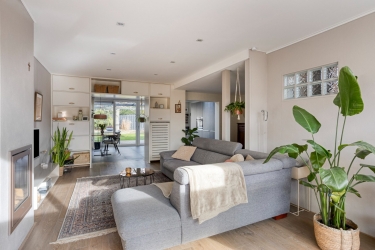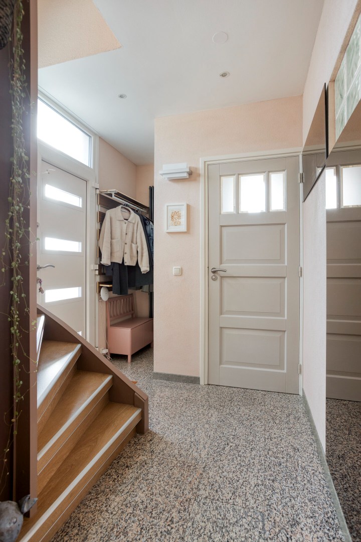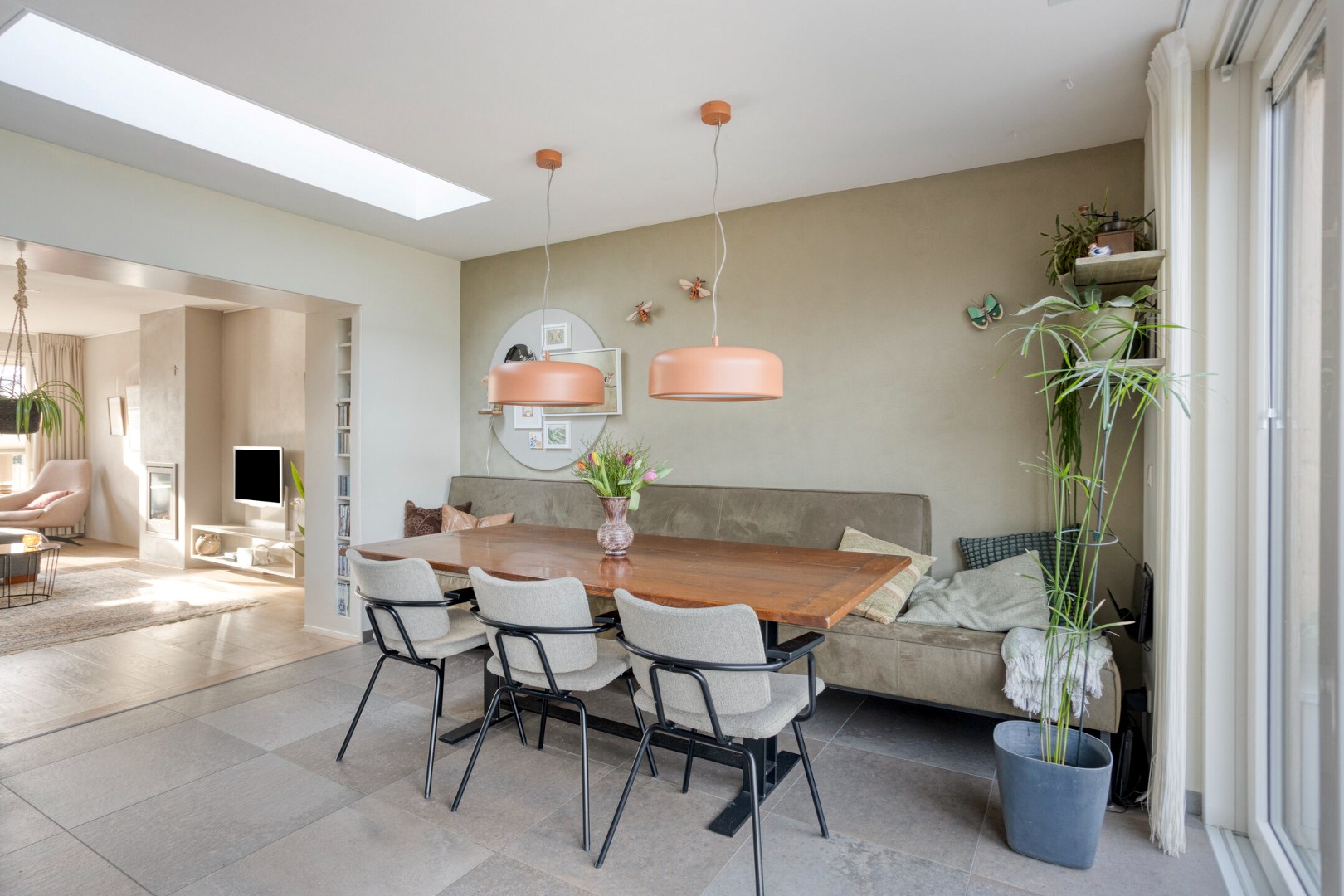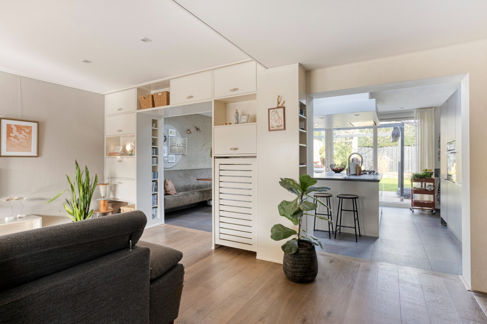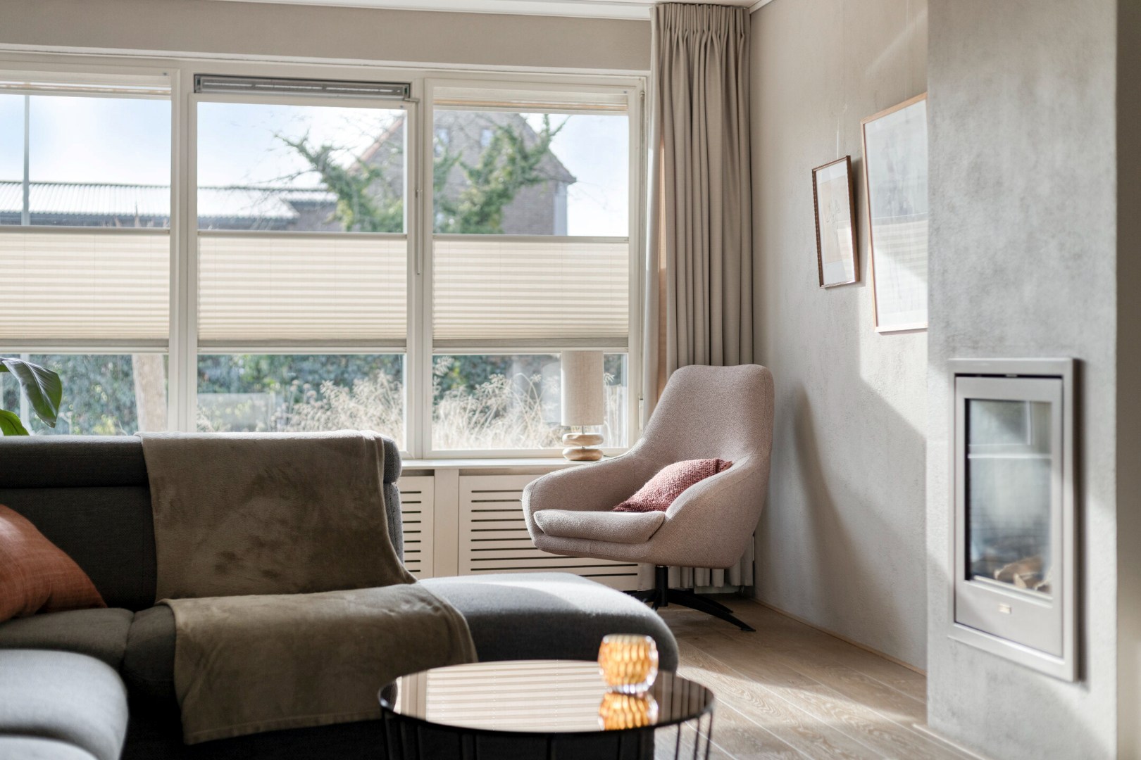 Via de entree betreedt u een verzorgde hal die direct een rustige en verzorgde indruk maakt. Hier bevinden zich het toilet, de trapopgang en de doorgang naar het leefgedeelte. Zodra u de woonkamer binnenstapt, valt de ruimtelijkheid meteen op. De zithoek aan de voorzijde is royaal opgezet en profiteert van een grote raampartij die zorgt voor een prettige lichtinval gedurende de dag. De haard vormt een subtiel middelpunt en draagt bij aan de warme, uitnodigende sfeer, terwijl de afwerking strak en tijdloos is gehouden, met vloeren en wanden die moeiteloos aansluiten bij uiteenlopende woonstijlen.