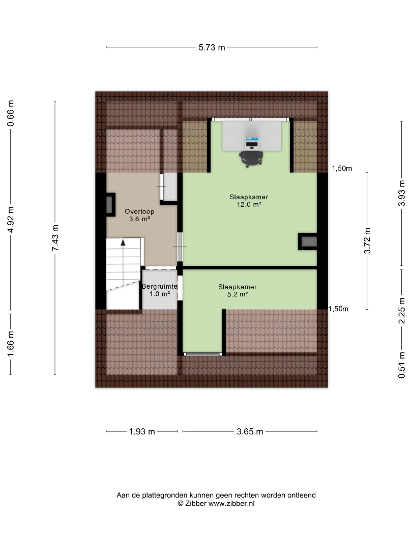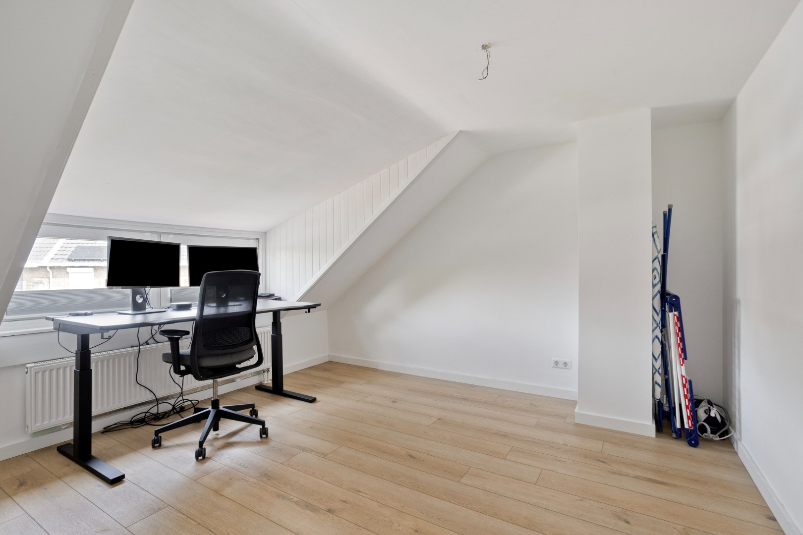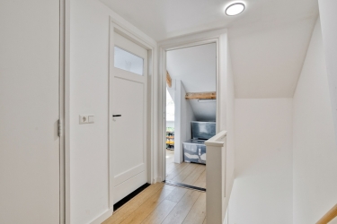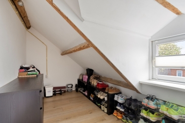 Via de vaste trap bereikt u de tweede verdieping, waar nog een ruime slaapkamer én logeer-/werkkamer zijn gerealiseerd. Ondanks de schuine wanden is er voldoende stahoogte aanwezig en zijn de ruimtes multifunctioneel te gebruiken, waaronder hobby's.