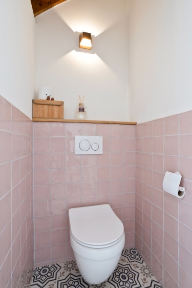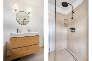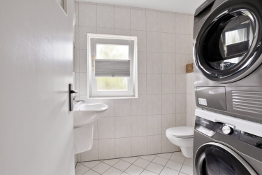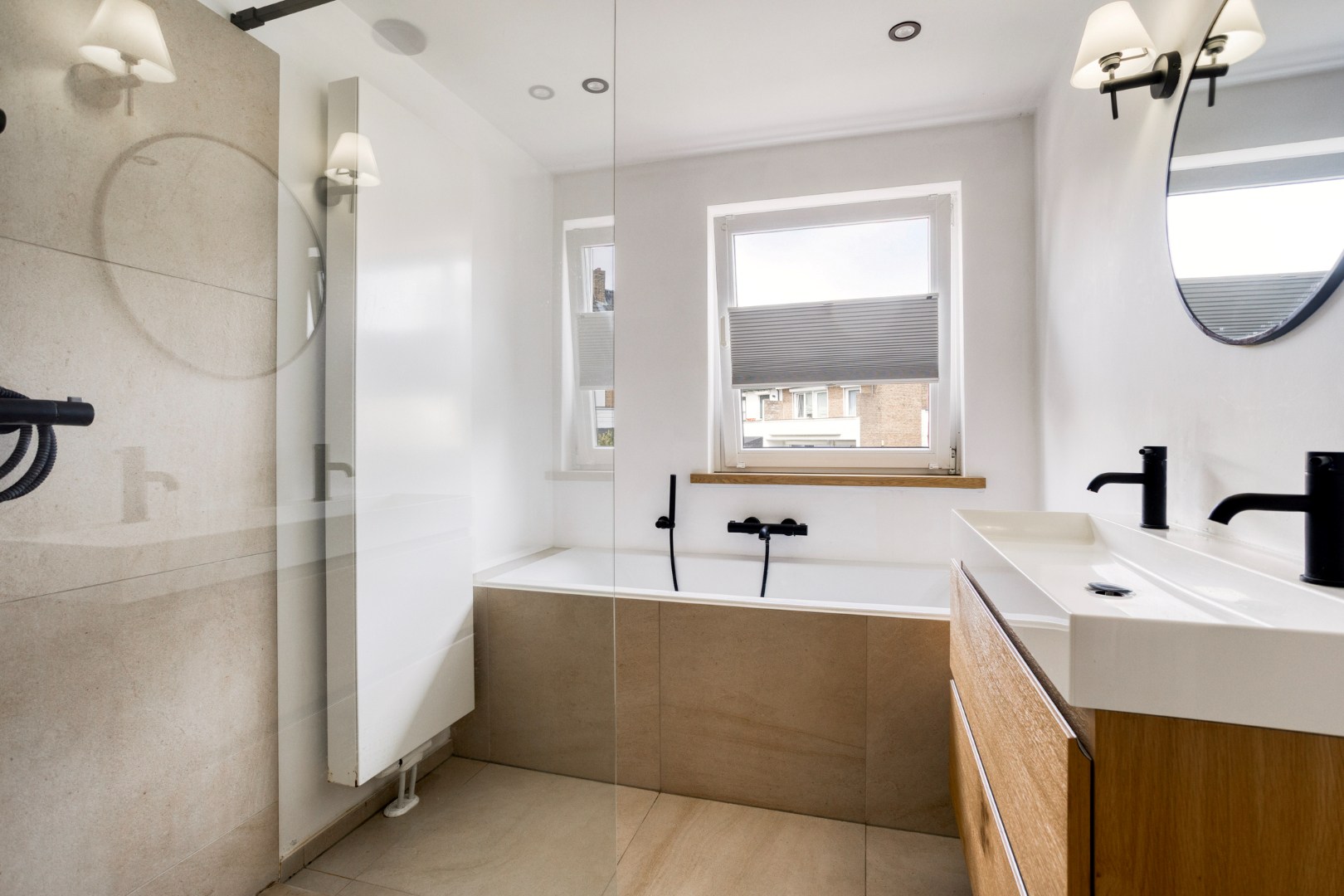 De moderne en volledig betegelde badkamer is gelegen aan de overloop en straalt comfort en luxe uit. U beschikt hier over een ligbad, een douche met glazen wand, dubbele wastafel met opbergmeubel en een designradiator. De ruimte is goed onderhouden en praktisch ingericht. Daarnaast is er een separate toilet-/wasruimte aanwezig, wat zorgt voor extra gemak.