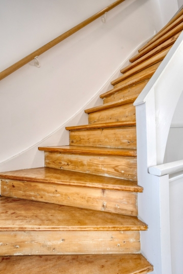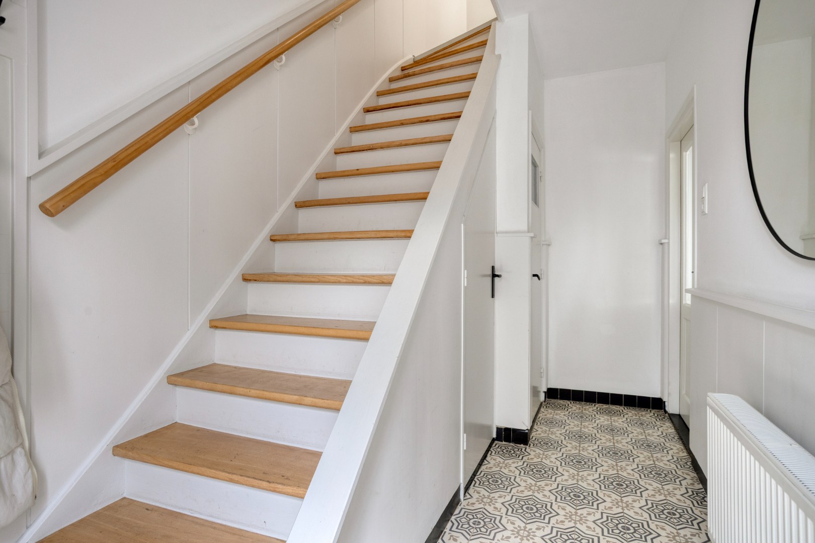 Via de vaste trap in de hal bereikt u de eerste verdieping, waar zich de overloop, twee slaapkamers, de ruime badkamer en een separate toilet-/wasruimte (voormalige badkamer) bevinden.