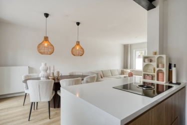 De open keuken sluit naadloos aan op de woonkamer en is zowel praktisch als modern ingericht. Het langwerpige aanrechtblad biedt u volop werkruimte, terwijl het kookeiland met inductiekookplaat en geïntegreerde afzuiging een echte blikvanger vormt. Daarnaast is de keuken voorzien van diverse inbouwapparatuur, waaronder een oven, vaatwasser en koelkast. Met de spoelbak (met quooker) en de ruime opbergmogelijkheden langs de wand is de keuken van alle gemakken voorzien.
